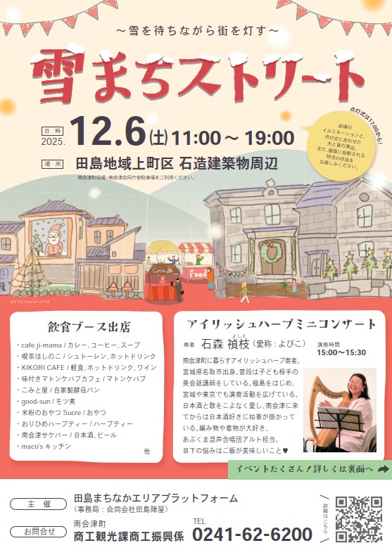 南会津町在住のアイリッシュハープ奏者 石森禎枝さんによるハープ演奏。地元合唱団によるクリスマスソング合唱なども予定されています。
