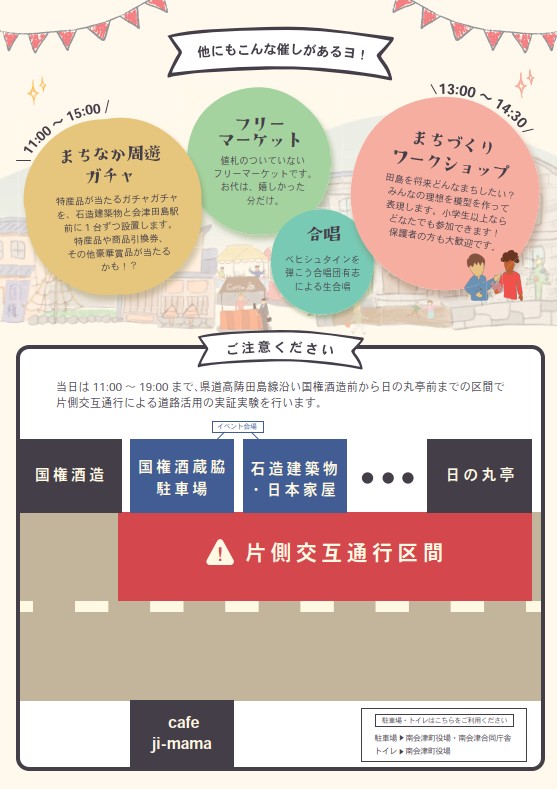 当日は、街中を走る県道の一部を片側交互通行とする道路活用の実証実験を兼ね、飲食ブースの出店、アイリッシュハーブのミニコンサート、フリーマーケットや街づくりワークショップ、特産品が当たるまちなか周遊ガチャなどの催しがめじろ押し。