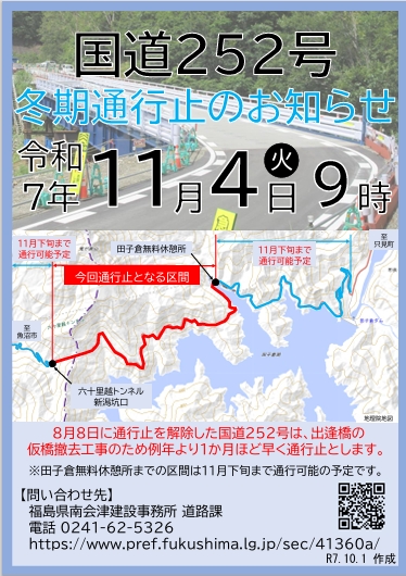 国道352号 第3七入橋の橋梁補修工事のため、令和7年10月1日から10月31日までの間、七入駐車場から尾瀬御池ロッジの区間が夜間通行止めとなります。 お問い合わせ先福島県南会津建設事務所 道路課電話 0241-63-5 […]